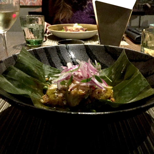 - Cebiche chifa with salmon, peanuts, ginger, wonton strips, cilantro, pickled vegetables, sesame leche de tigre