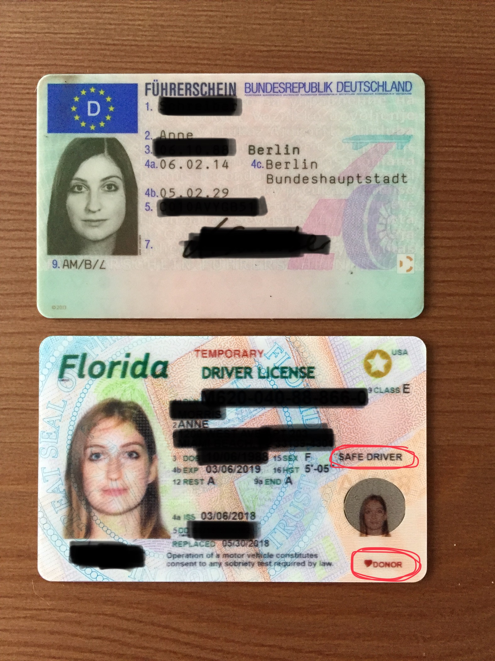 Hier ein direkter Vergleich zwischen meinem deutschen und amerikanischen Führerschein.